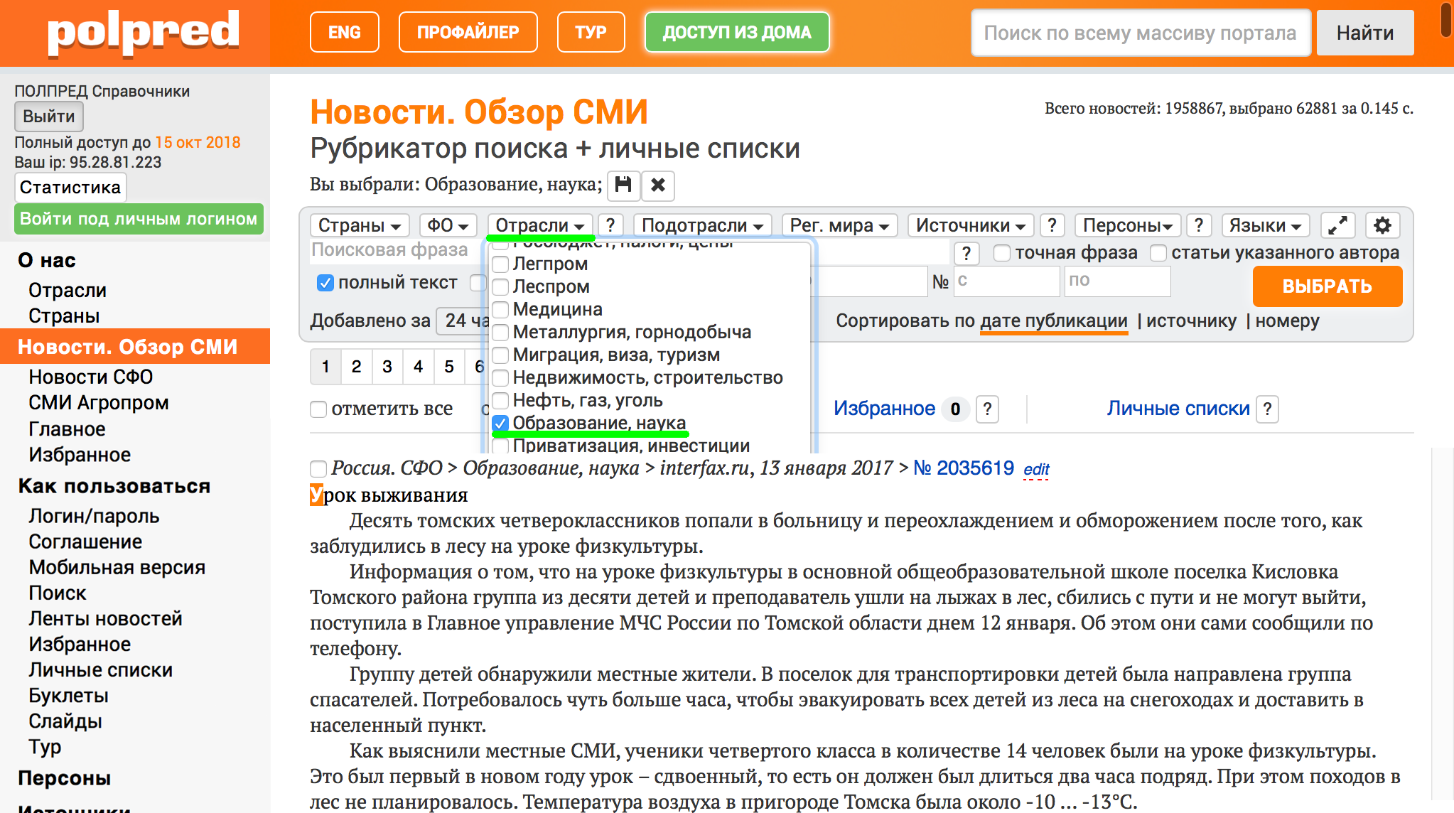 Рубрикатор «Новости. Обзор СМИ» в меню слева. На картинке выше показаны новости с тематикой «Образование и наука». Такую же выборку можно сделать по остальным 52 отраслям. Каждая новость может соответствовать трем отраслям (тегам) из нашего списка — видны в строке над текстом новости. В поисковом запросе отмечается любое число отраслей, стран, источников.